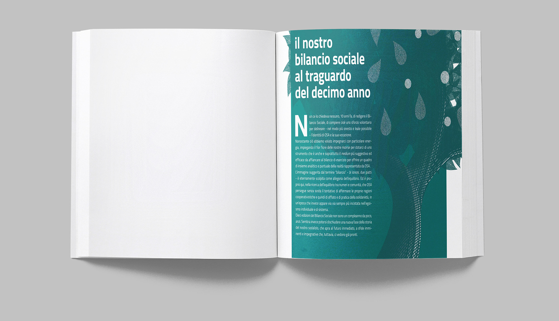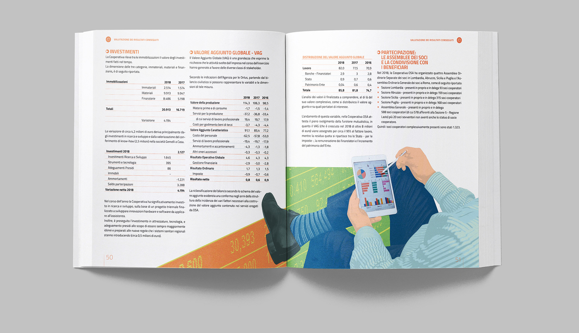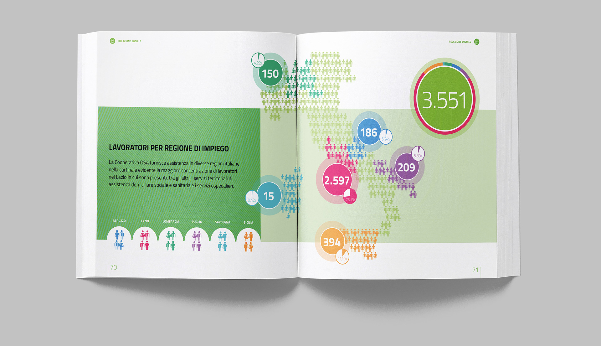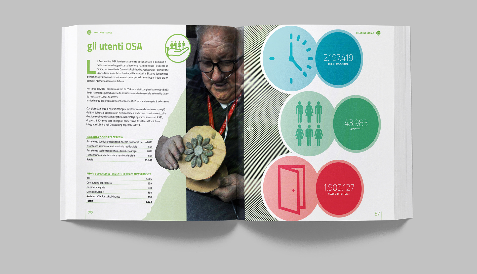 Progettazione grafica del bilancio sociale di OSA, con la realizzazione di illustrazioni e infografiche